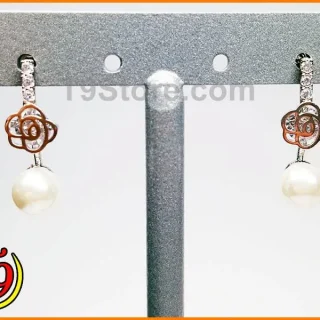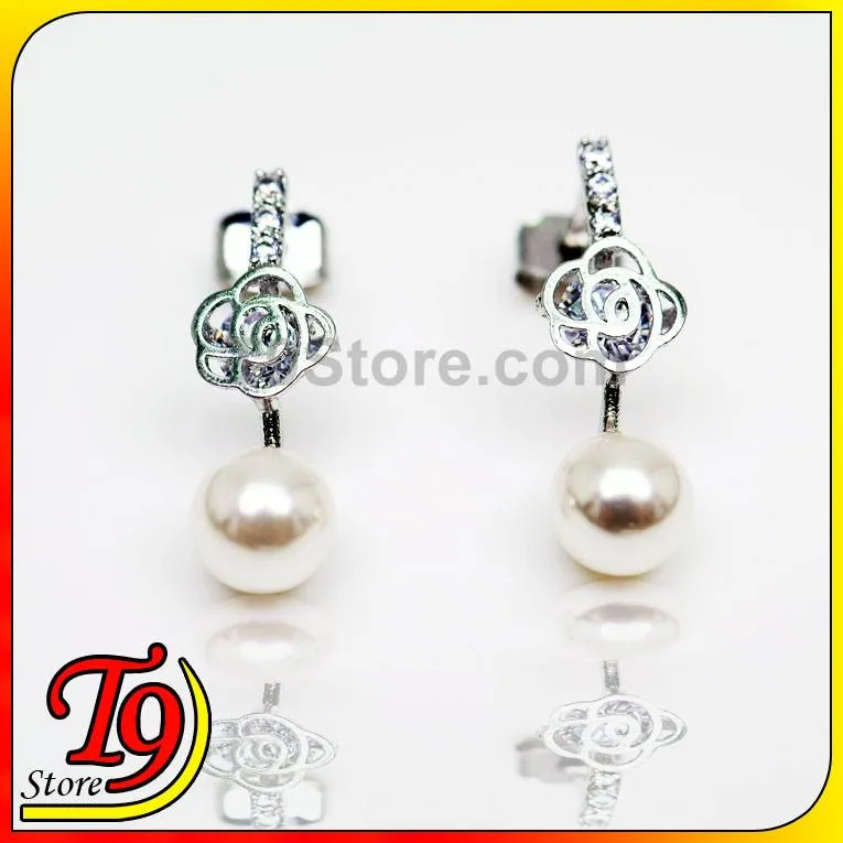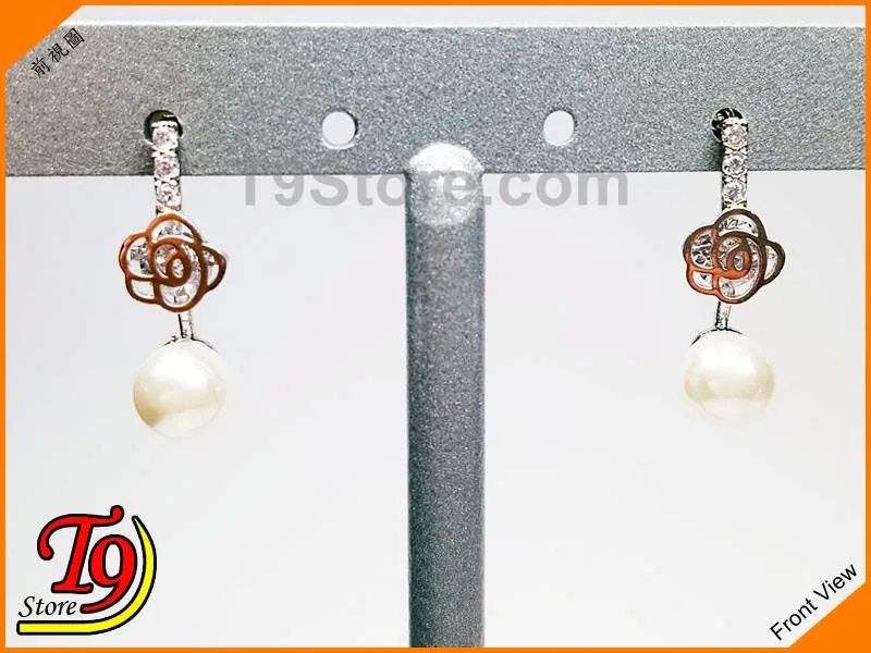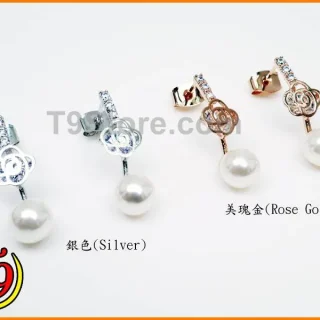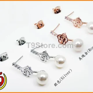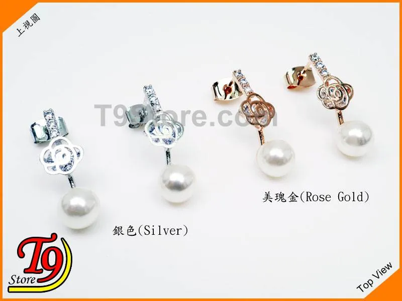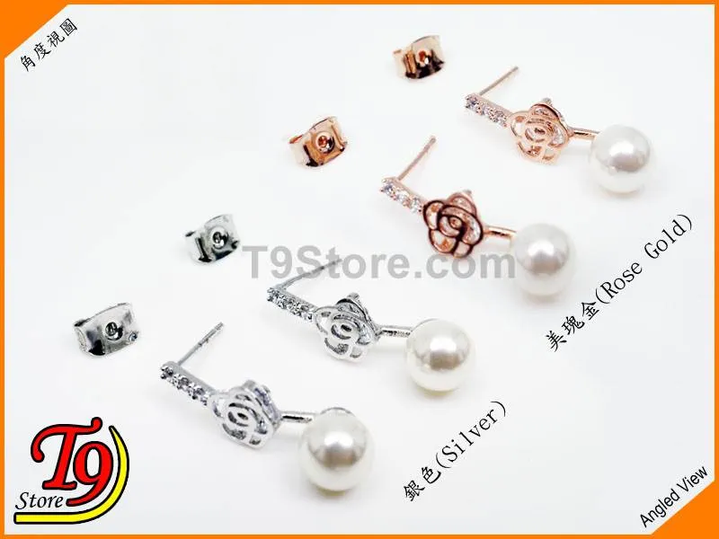 韓國製 玫瑰花水鑽珍珠銀針耳環