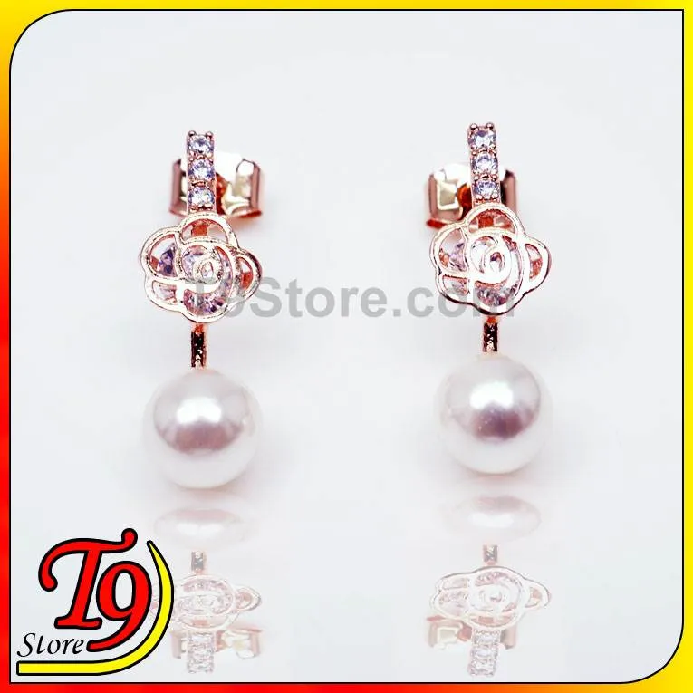 韓國製 玫瑰花水鑽珍珠銀針耳環