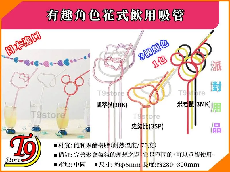 日本進口 有趣角色花式飲用吸管(3入) (凱蒂貓 史努比 米老鼠)